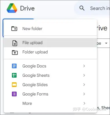 步骤 2. 点击"新建文件夹"按钮,然后选择"文件上传"或"文件夹上传",将要从电脑传输到 Google 云端硬盘的文件或文件夹上传。