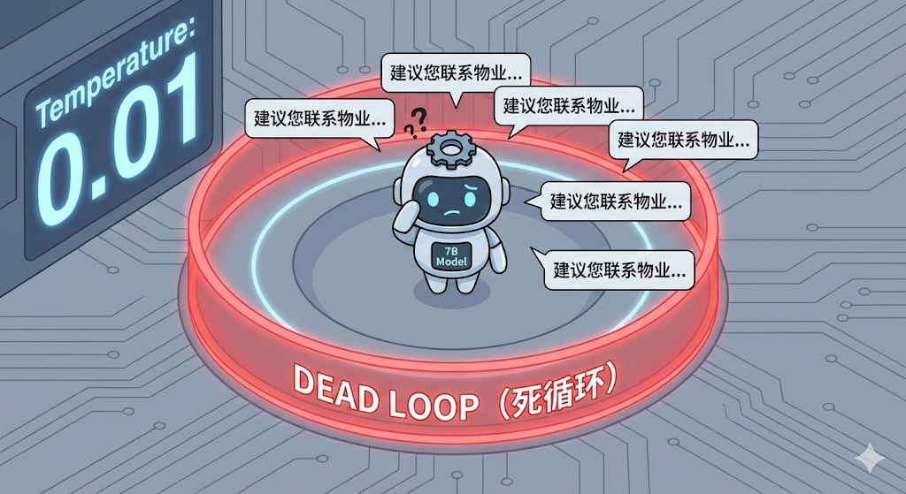一旦模型输出了那句"兜底废话"(比如"建议联系物业"),在生成下一个词时,它回头看上下文,发现接这一句最顺口(概率最高)。由于没有随机性(Randomness)让它去尝试"第二选项",它就被锁死在这个概率的高地上下不来了。