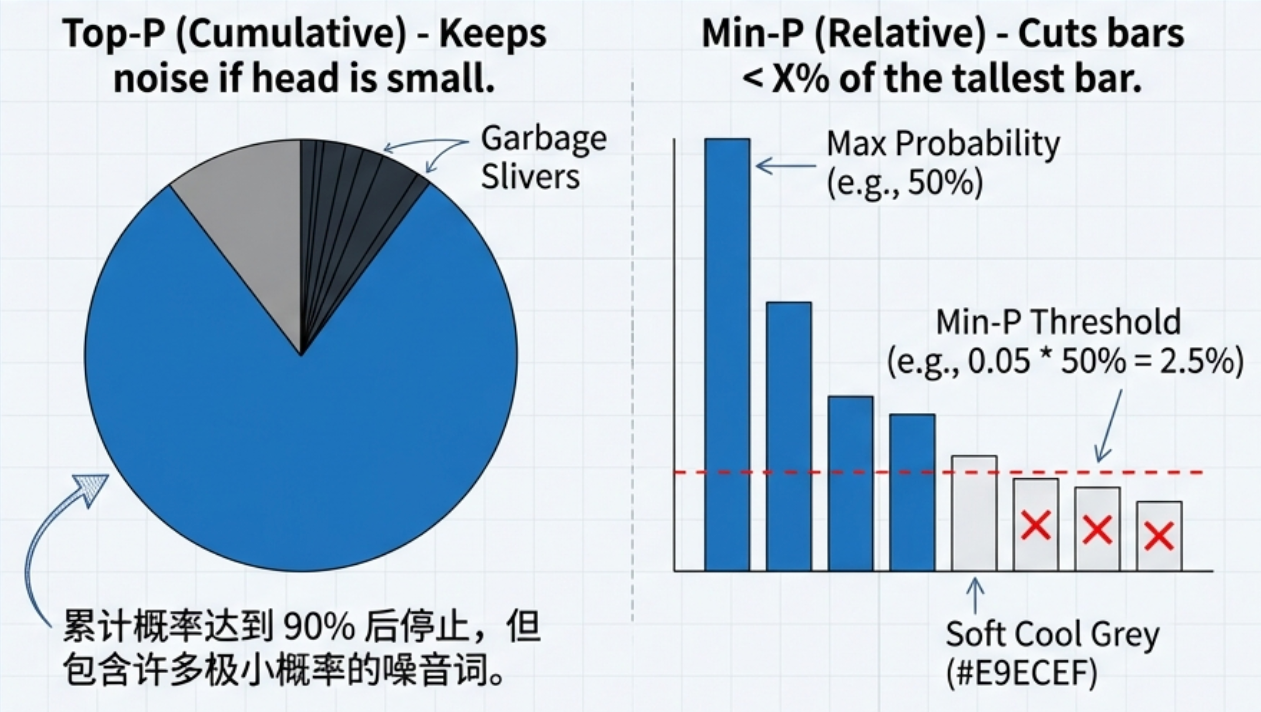 top-p(核采样)**:累积概率截断。 min-p:小模型的救星 。它切掉那些相对于最大概率词过于微小的选项。比如最大概率是 50%,min-p=0.05会切掉所有概率低于 2.5% 的词。这比 Top-P 更能有效去除小模型的胡言乱语。