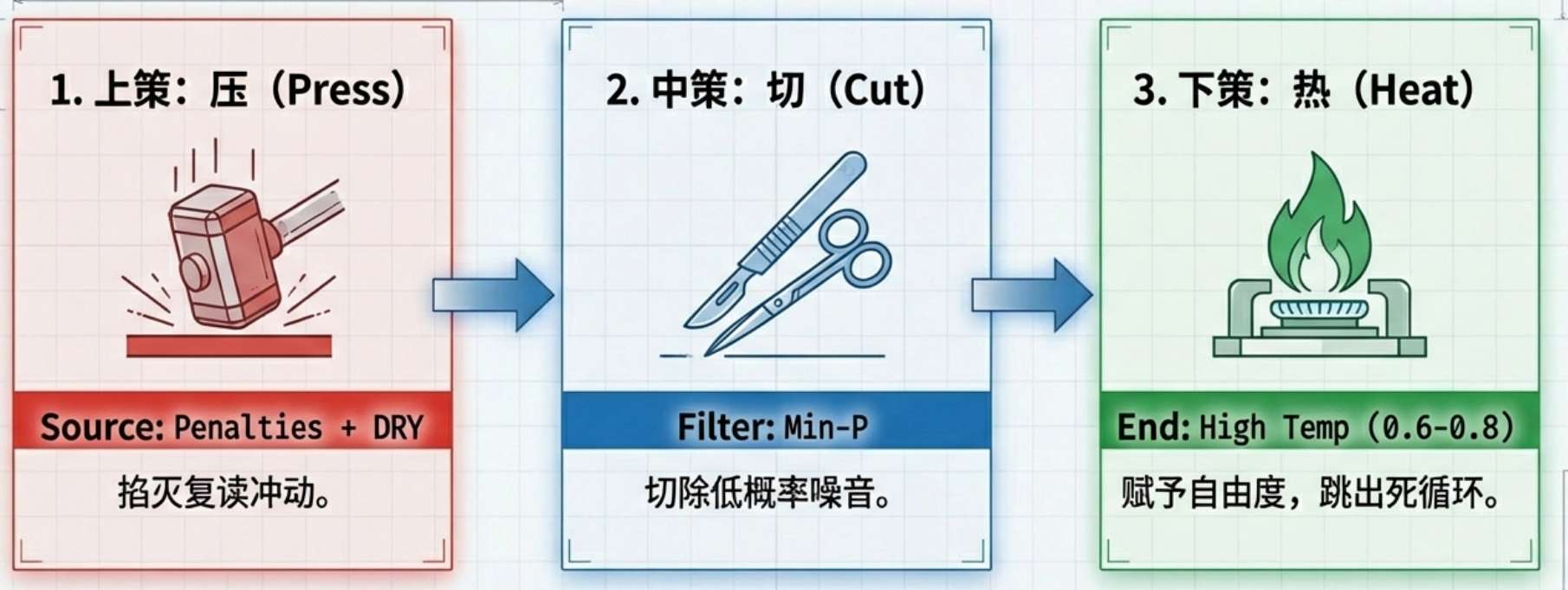 记住这个口诀:先惩罚(Penalties/Dry)压住复读欲,再过滤(Min-P)切掉垃圾词,最后升温(Temp)给它找条新出路。