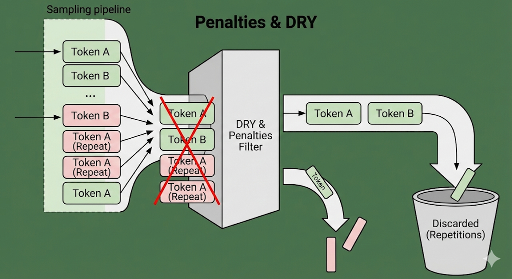 penalties(传统惩罚)**:包含 Repetition/Frequency/Presence Penalty。系统检查历史记录,如果这个词刚说过,就强行扣分。 dry(DRY Sampling):关键点! 这是专门为了解决死循环引入的"大杀器"(Don't Repeat Yourself)。它检测 N-gram(连续词组)重复。