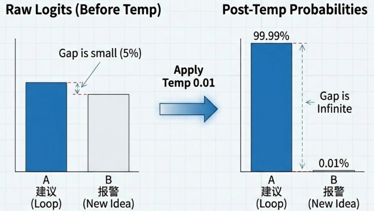 - 假设模型陷入逻辑死角,复读词"建议"的原始概率是 40%,新思路"报警"的概率是 35%。差距很小。