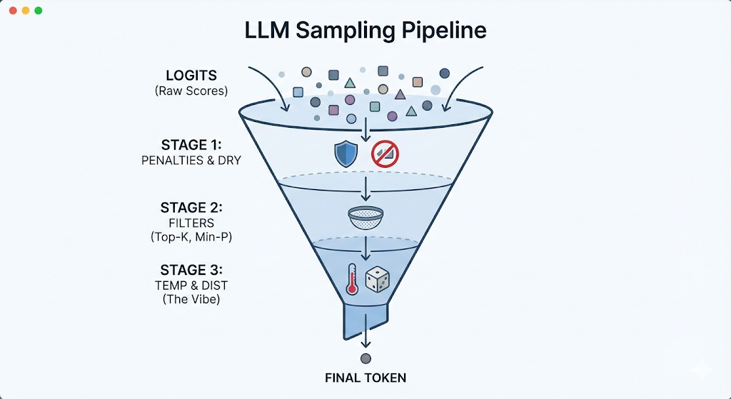 logits -> penalties -> dry -> top-n-sigma -> top-k -> typical -> top-p -> min-p -> xtc -> temp-ext -> dist