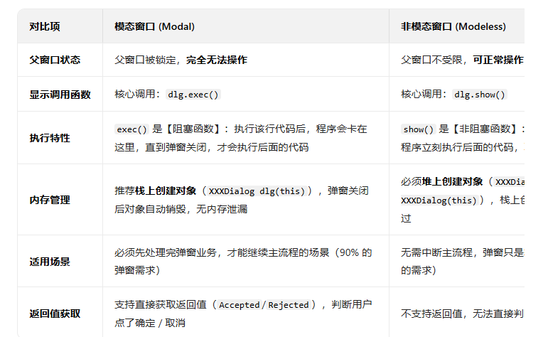 - 模态窗口会阻塞父窗口的所有交互 ,这是 Qt 里最常用的弹窗方式。