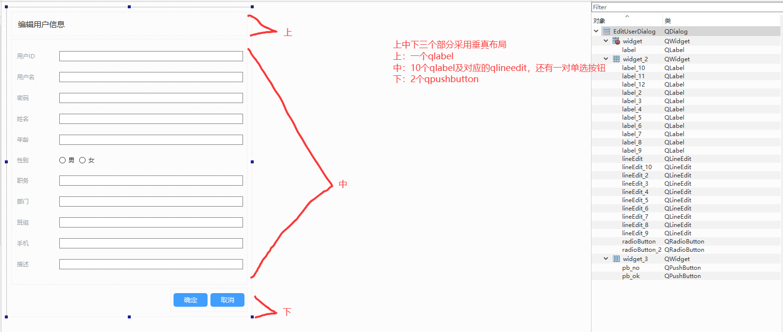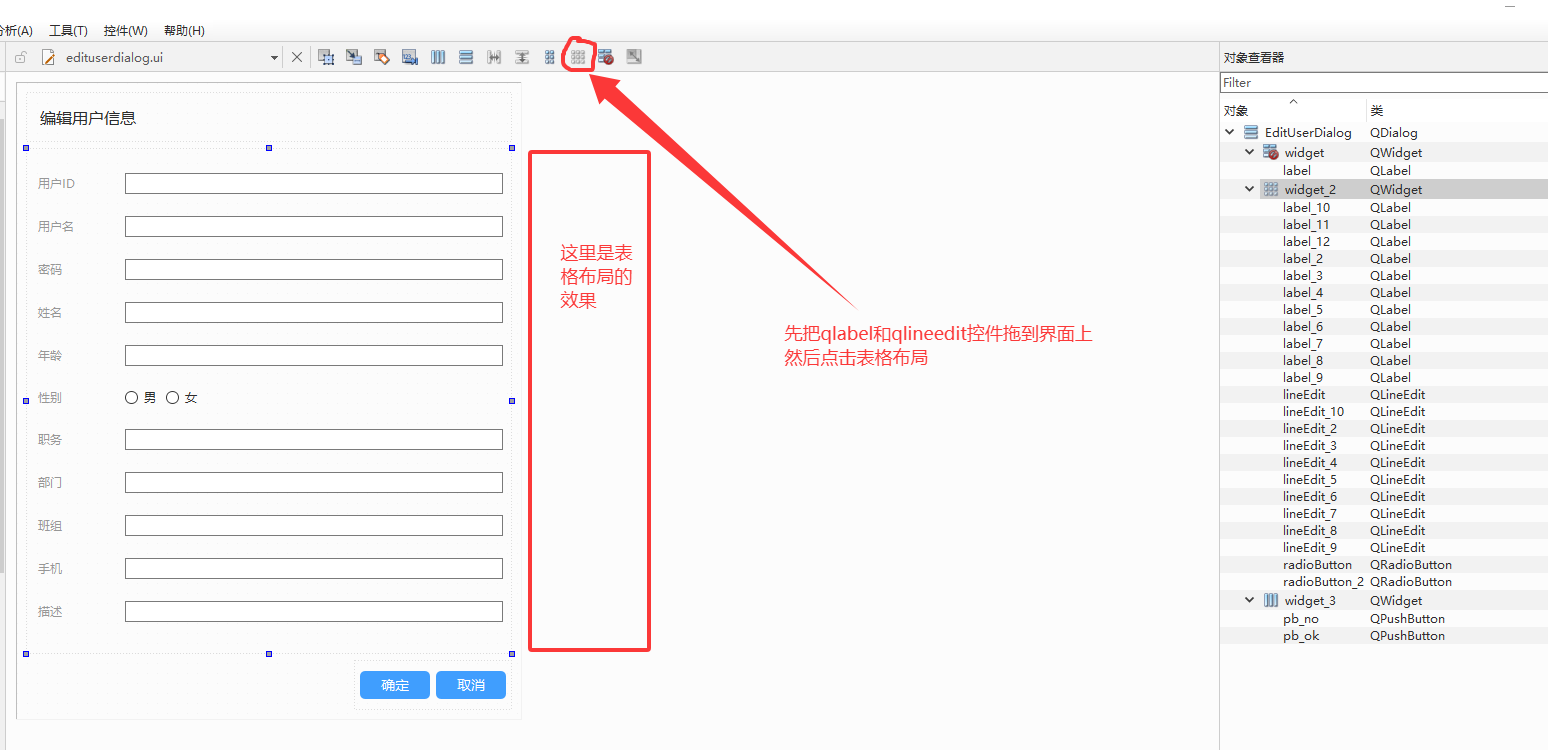 QFormLayout 表单布局:专门用于做「表单」的布局,自动分成两列:左列是「标签(QLabel)」,右列是「输入控件(QLineEdit/QComboBox 等)」,完美适配「标签 + 输入框」的场景,比 QGridLayout 更简洁。