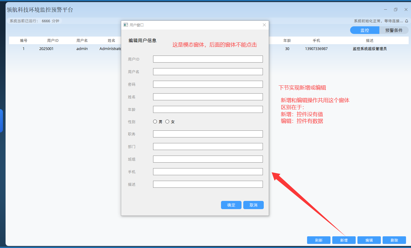 新增用户属于表单类界面, QLabel(文本标签) + QLineEdit(单行输入框) + QRadioButton(单选按钮 - 性别) + QButtonGroup(单选分组) + QSpinBox(年龄数值选择) + QPushButton(提交 / 重置按钮),全部是基础核心控件,无冷门控件