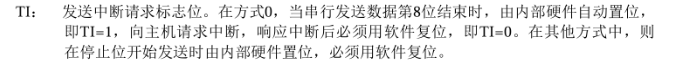 - TI位,用来查询8位数据是否发送完毕,发送完毕后会自动置1;必须用软件清0