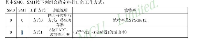 - 将PCON寄存器中的,SMOD0位清0,代表通过SCON寄存器中的SM0和SM1这两个位共同指定串口
