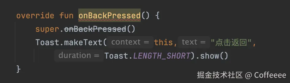 这里的红线并不会影响编译,但是跑起来后发现点击back按钮,我们的toast就出不来了,明显没有走到onBackPressed方法里去