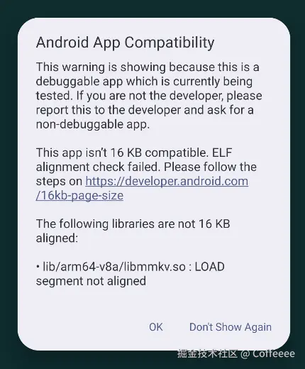 出现这个框子的前提是你的应用运行在了不低于Android16的设备上并且没有完全对齐16kb,那么会出现这个弹框警告你一下,但是不影响app使用,不管你的target是35还是36都会看到这个弹框,而且如果你不想要让这个弹框出现,可以在AndroidManifest.xml中添加下面这个配置 android:pageSizeCompat="enabled",那么弹框就不会出现了,使用pageSizeCompat必须得将targetSdk升级到36,但虽然官方解释如此,但是我自己尝试下后发现无论将pageSizeCompat设置为enabled还是disabled都无法阻止弹框出现,无论是debug还是release包都尝试了没有任何变化,不知道是不是模拟器的关系,反而使用以下命令是可以的