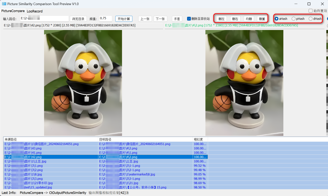 软件支持aHash、pHash、dHash三种查重算法,能够从不同维度精准判断图片相似度,确保不遗漏任何重复图片。