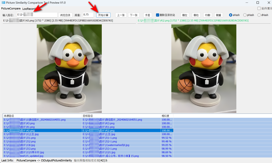 操作特别简单:先选择需要查重的文件夹路径,然后点击【开始计算】按钮,软件就会自动扫描分析。如果图片数量比较多,可能需要耐心等待一会儿,毕竟要保证查重的准确性嘛。