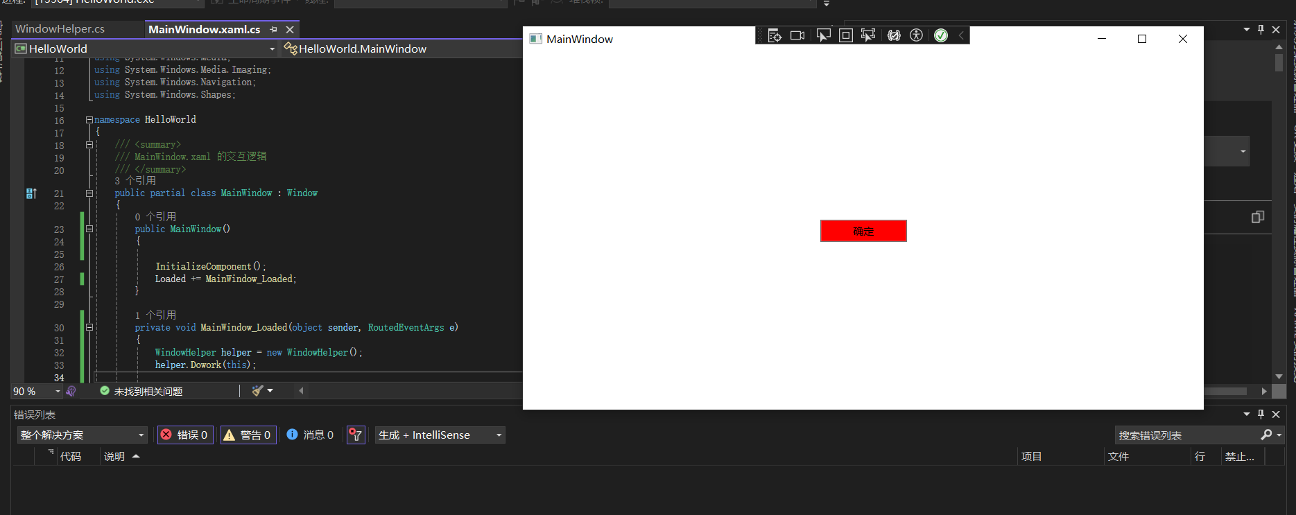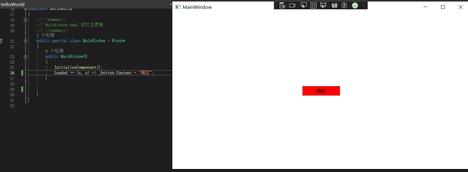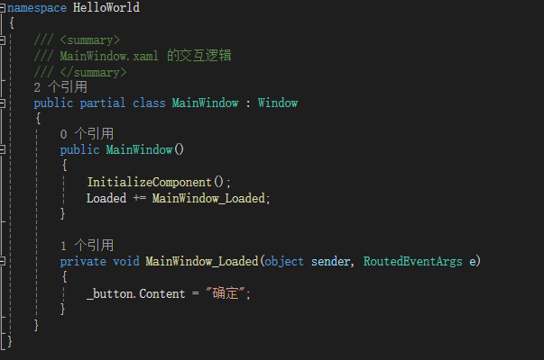 窗体加载时修改按钮内容方式有好几种,首先在当前线程里面直接对loaded窗体加载事件(昨天的window生命周期有介绍)添加订阅方法,方法里面修改按钮内容。