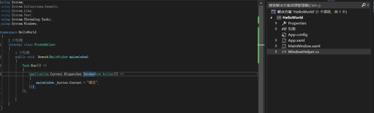 DispatcherObject是WPF中的顶级基类,虽然在整个C#语言中不是最基础的(继承自System.Object),但在WPF体系中处于核心地位。为了体现跨线程调度功能,采用窗体加载时修改按钮内容的方式来展示效果。