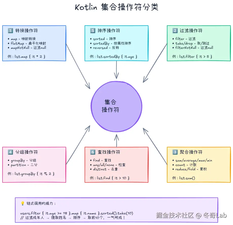 仅仅5行代码,没有临时变量,逻辑清晰流畅,可读性极强!这就是Kotlin集合框架的魔法。