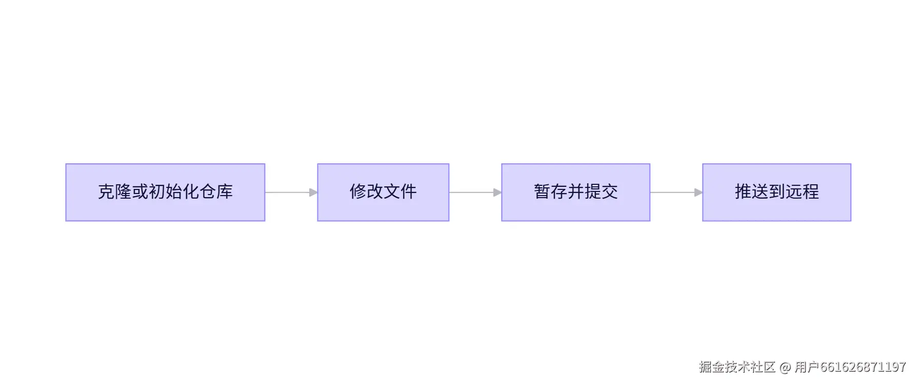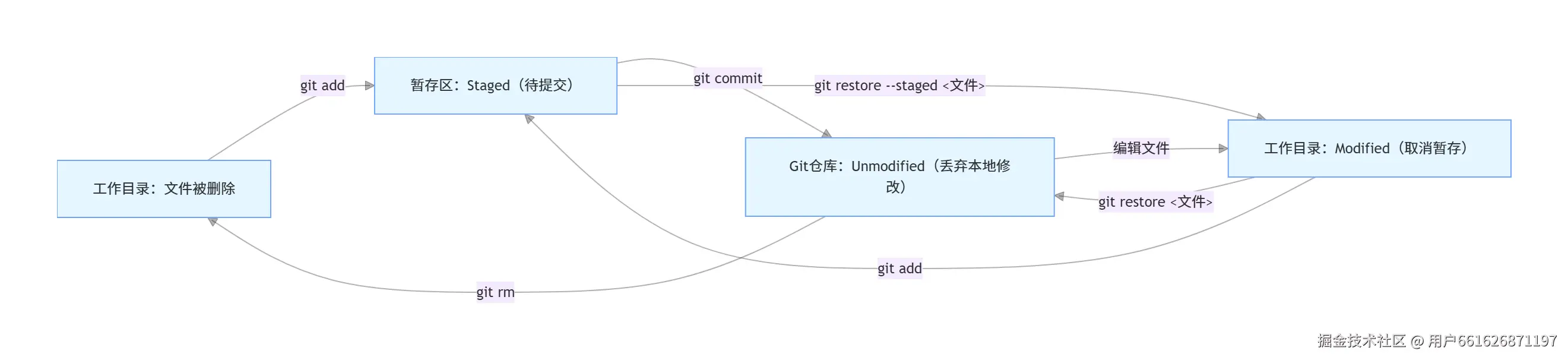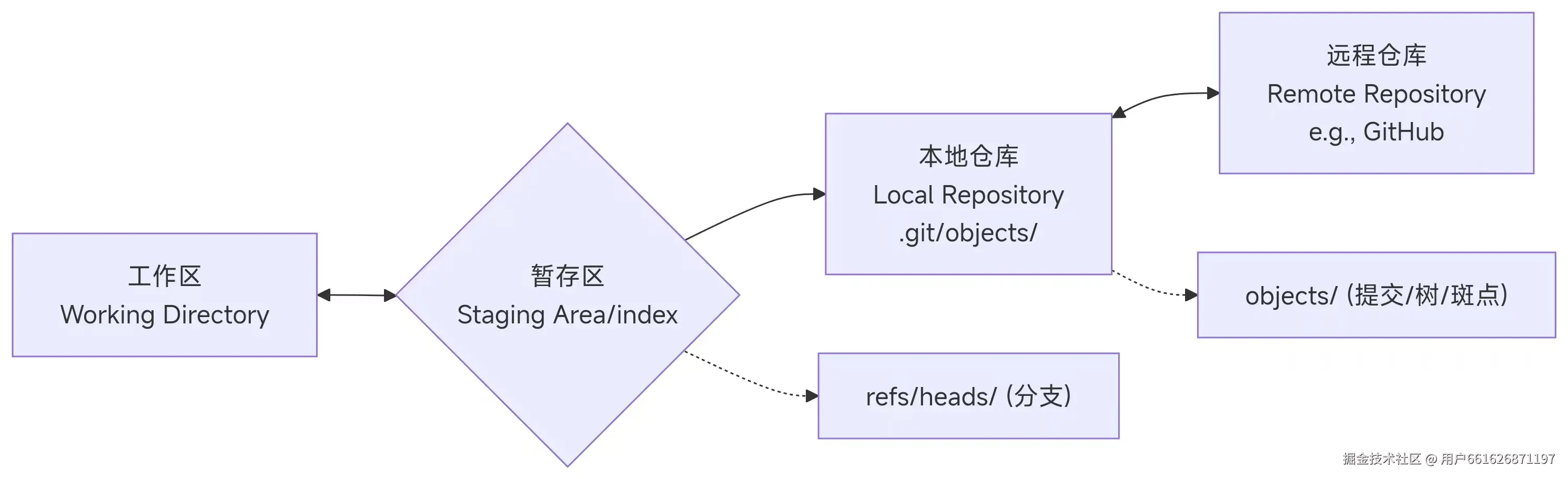 - 暂存区(Index) :是一个中间区域,通过git add将工作区的修改"挑选"出来,放入暂存区。下次提交会提交暂存区的内容。
