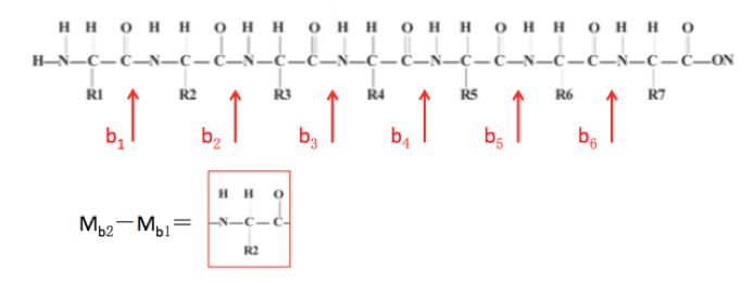 介绍完肽段碎裂的规律后,我们可以发现每个肽段碎裂产生的离子都有各自的特点,其中b型离子较为特殊,因为b型离子断键的位置位于两个氨基酸残基之间,因此每两个相邻的b离子的质量差等于NH2C2O-R(如图3所示)。不同的氨基酸的R基质量是不同的,因此,如果能够在二级质谱的众多质谱峰中确定b离子的峰图,根据出两个相邻的b型离子的质量差,就可计算出R基的质量大小,然后根据R基即可确定对应的氨基酸。除此之外,如果氨基酸残基上有翻译后修饰,也可以使用b型离子间的质量差来计算翻译后修饰的质量,从而推算可能的翻译后修饰。