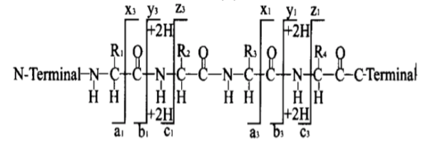 小编在文章前面介绍蛋白从头测序的原理时,也提到过蛋白质从头测序分析的理论基础是基于肽段在二级质谱诱导碎裂时是有规律地断裂的。根据肽段断裂的位置,可以产生不同种类的离子,在靠近N端的地方断裂产生的离子有a,b,c三种类型的离子,在靠近C端的地方断裂产生的离子有x,y,z三种类型。以N端断裂离子为例,其中a型离子由第一个氨基酸C=O前面的C-C键断裂产生的N端离子,b型离子是由第一个氨基酸和第二个氨基酸之间的C-N键断裂产生N端离子,c型离子是由第二个氨基酸的N-C键断裂形成的(如图2所示)。对于N端端裂的离子来说,断裂的位置不同产生多种不同的a,b,c型离子,为了进一步对在不同的断裂点产生的同一类型的离子进行区分,每个离子下方都标记了罗马数字指代断裂的位置。(如图2,a1,a3指代断裂位置不同的同一类a型离子)
