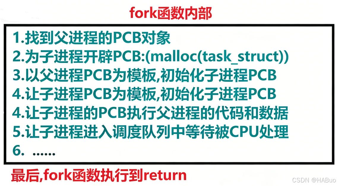 首先,前面进程地址空间中我们知道了,创建一个子进程,它的PCB以及进程地址空间,还有页表都会按照父进程的拷贝一份,且fork之后,父子进程都会执行代码的本质是它们都被内存调度了而当一个函数执行到return时,它的核心工作才算执行完成,于是我们可以想象一下fork函数内部的一些代码信息: