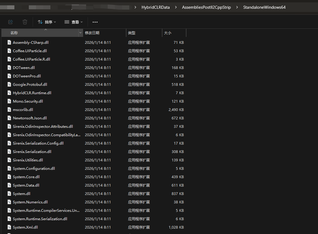 HybridCLR会自动把dll文件复制到{project}/HybridCLRData/AssembliesPostIl2CppStrip/{target}文件夹下
