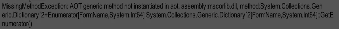 MissingMethodException:AOT generic method not instantiated in aot.assembly:mscorlib.dll,method:System.Collections.Generic.Dictionary`2+Enumerator[FormName,System.Int64]System.Collections.Generic.Dictionary`[FormName,System.Int64]::GetEnumerator()