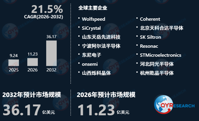 根据QYResearch的统计及预测,2025年全球碳化硅晶锭市场销售额达到了9.24亿美元,预计2032年将达到36.17亿美元,年复合增长率(CAGR)为21.5%(2026-2032)。