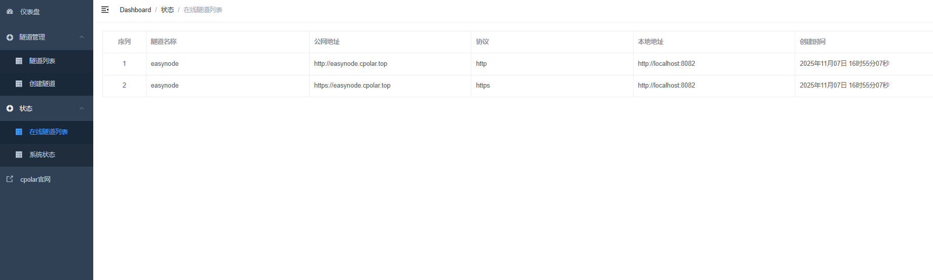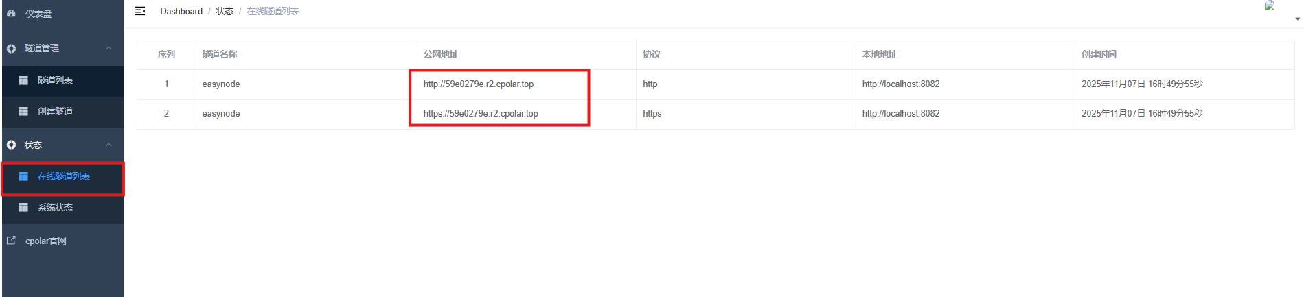 更新完成后,打开在线隧道列表,此时可以看到随机的公网地址已经发生变化,地址名称也变成了保留和固定的二级子域名名称。