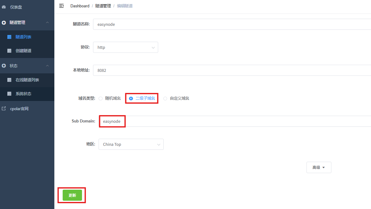修改隧道信息,将保留成功的二级子域名配置到隧道中