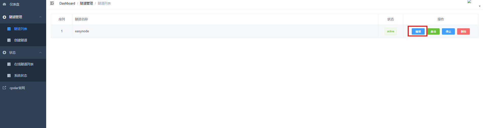 登录cpolar web UI管理界面,点击左侧仪表盘的隧道管理------隧道列表,找到所要配置的隧道,点击右侧的编辑。