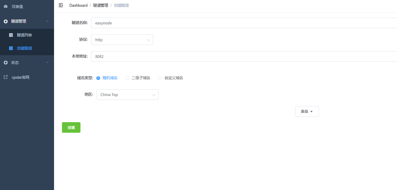 - 隧道名称:可自定义,本例使用了:easynode,注意不要与已有的隧道名称重复