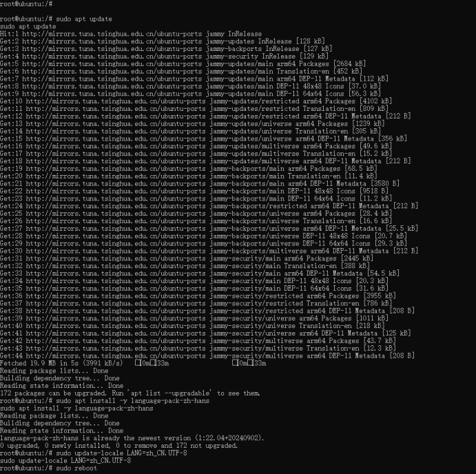 sudo update-locale LANG=zh_CN.UTF-8 #设置系统语言环境为中文