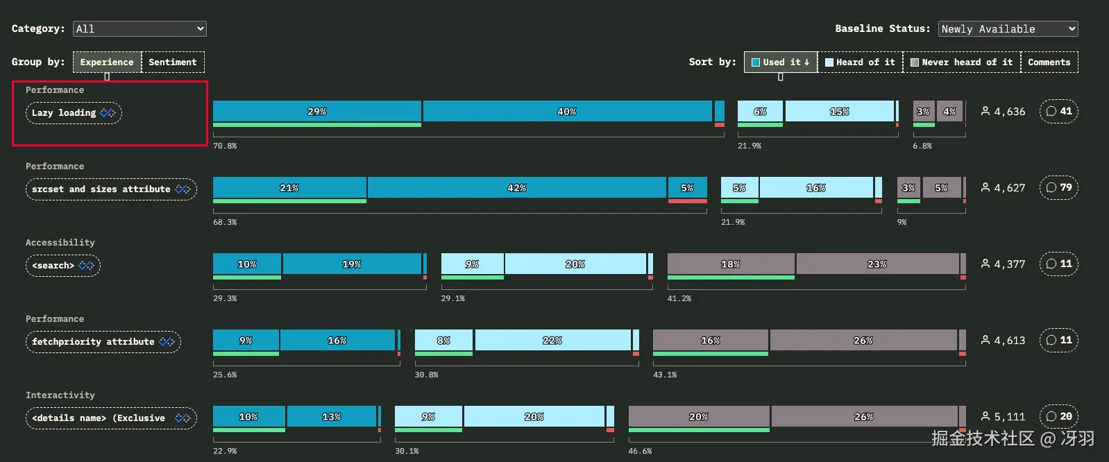 使用过延迟加载的受访者比例高达 70%,是"新可用(Newly Available)"功能中最常用的功能。