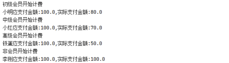 System.out.println(member.getName() + "应支付金额:" + member.getPay() + ",实际支付金额:" + pay);