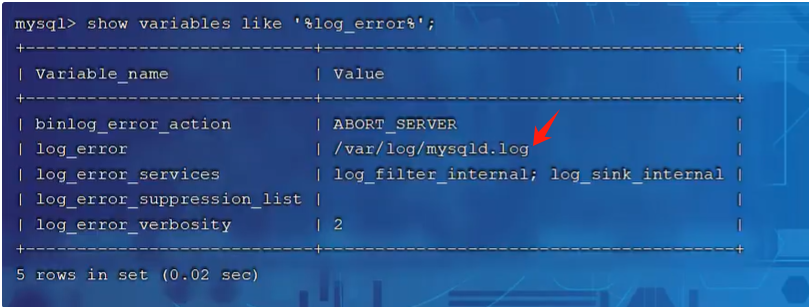 -- 登录mysql,查看系统变量 show variables like '%log_error';