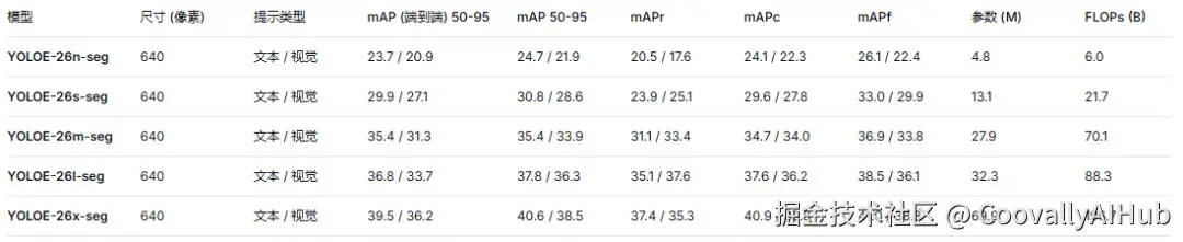 基于 YOLO26 架构与训练策略,Ultralytics 同步推出 YOLOE-26 开放词汇分割模型系列。