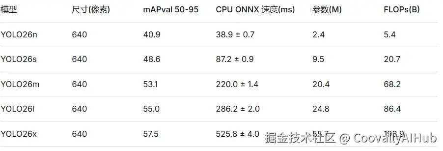 性能方面,YOLO26 大幅提升性能上限。与 YOLO11 相比,其 Nano 版本在 CPU 推理场景下最高可实现 43% 的性能提升,成为目前边缘端与基于 CPU 部署场景中,速度与精度兼顾的领先目标检测模型之一。