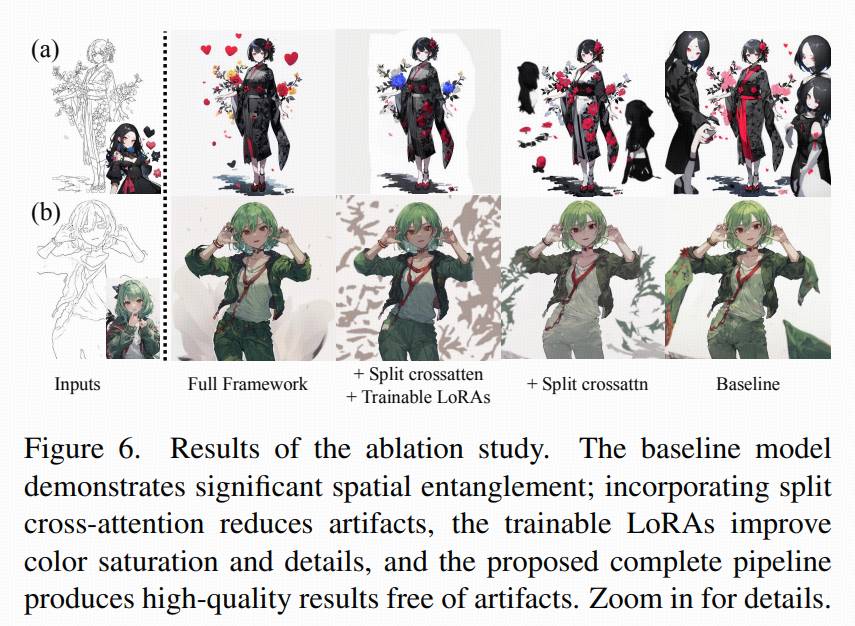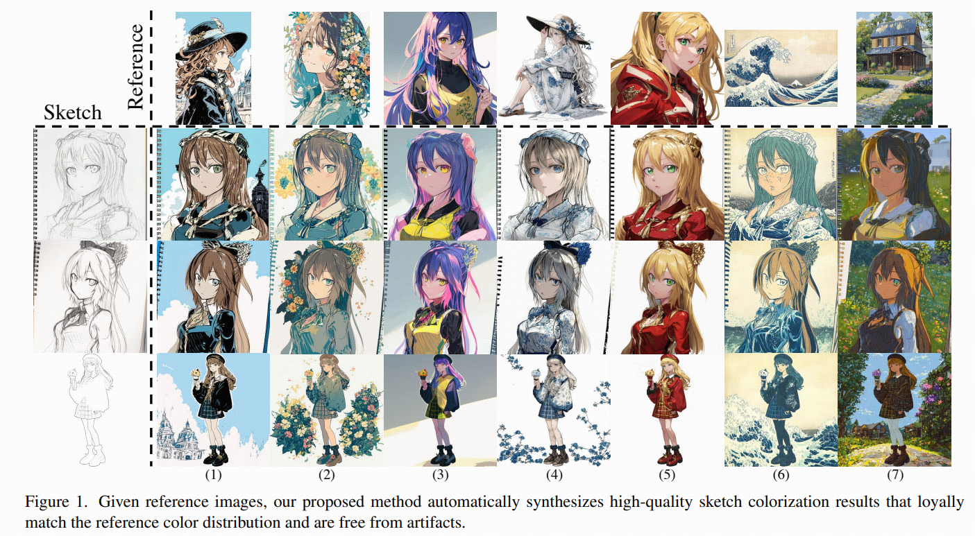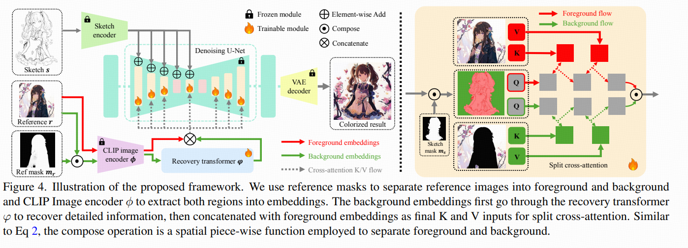 动机:解决空间纠缠的问题。参考图上色通常是:输入线稿/草图(sketch)+ 一张参考彩色图(reference),希望输出的颜色/材质"像参考图",但结构/布局"像线稿"。困难在于:reference 的图像特征(尤其是 ViT/CLIP 的 token)天然带有布局、大小、对象共现等语义,当 reference 是"只有角色的立绘/大头照"时,这些语义很容易"越权",导致模型在背景里也"长出角色碎片/衣服/头发纹理",或者把角色配色污染到背景------这就是空间纠缠。