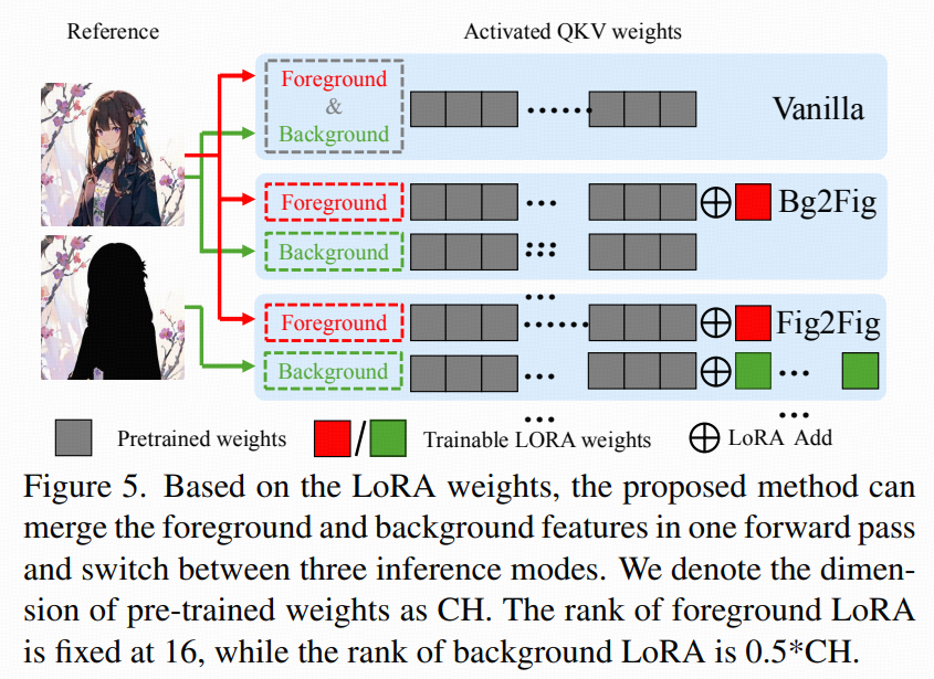 背景 LoRA rank = 0.5×min(Dq,Dkv)(比前景大得多)