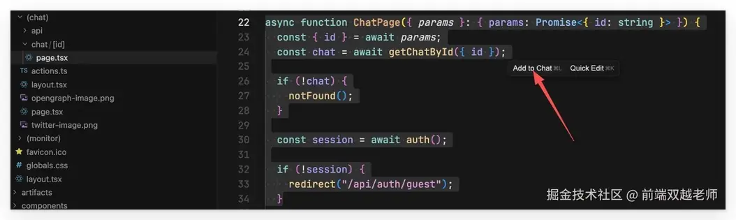 同时这里的功能也最为丰富。除了自己输入,你还可以选中一段代码、或着一段报错信息,点击 Add to chat 按钮,把这些内容传递给 AI。