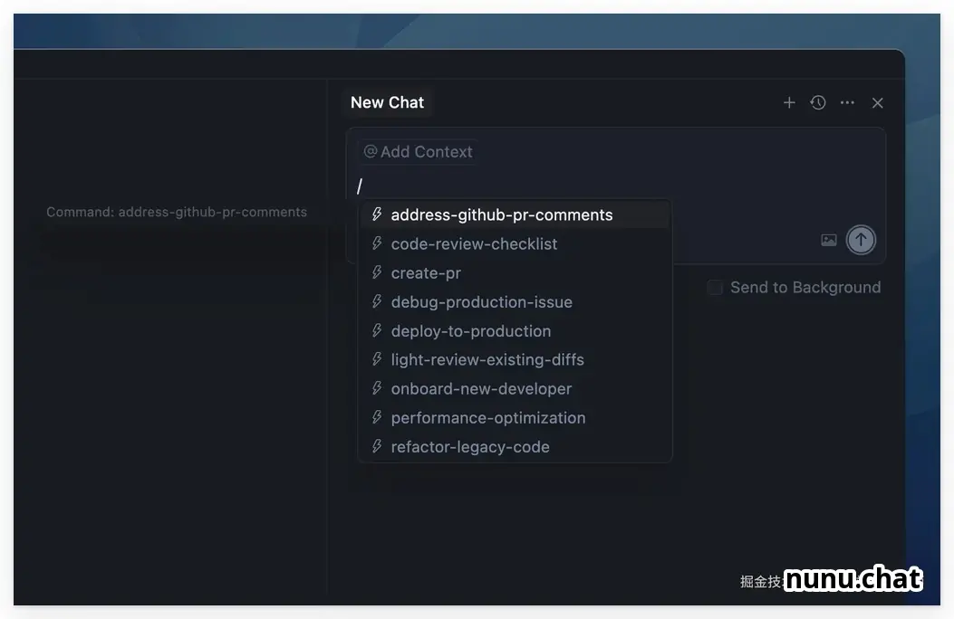 你还可以通过 / 来使用 command 命令。命令要自己定义,在 .cursor/commands/ 目录下创建一个 xxx.md 文件即可定义一个命令。