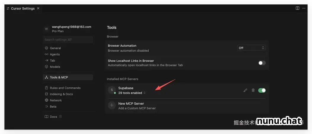 在这个页面可以看到 Cursor 支持的所有 MCP server cursor.com/cn/docs/context/mcp ,还是国外的多... 选择一个安装即可。安装完成,在 Cursor 设置页面可以看到这个 MCP server 以及它有几个 tools。