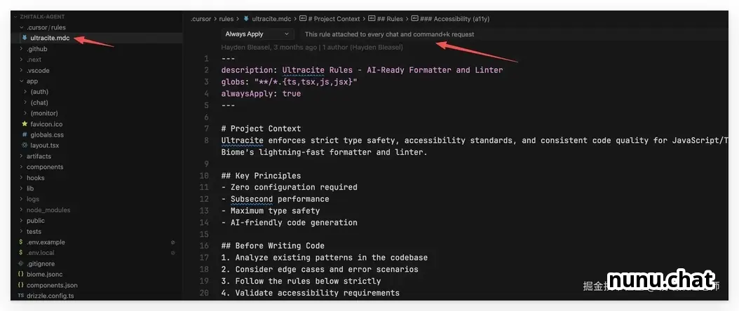 就像 system prompt 一样,我们可以定义当前代码库的统一的规则和要求,这是所有的 AI 编程工具都具备的功能。在 .cursor/rules/ 目录下,新建一个 xxx.mdc 文件