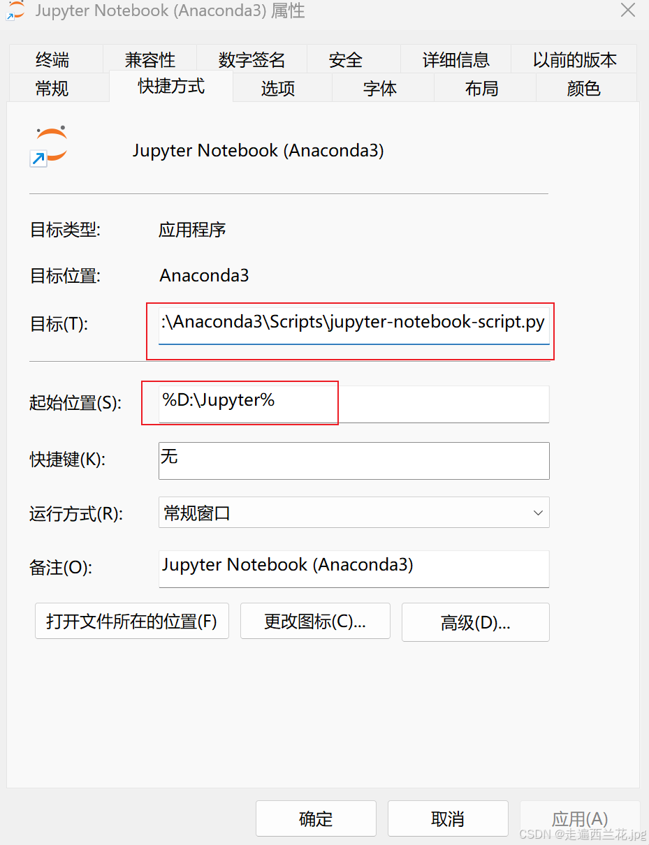 3、找到jupyter的图表,右键-->属性,将目标中的"%USERPROFILE% /"删掉,