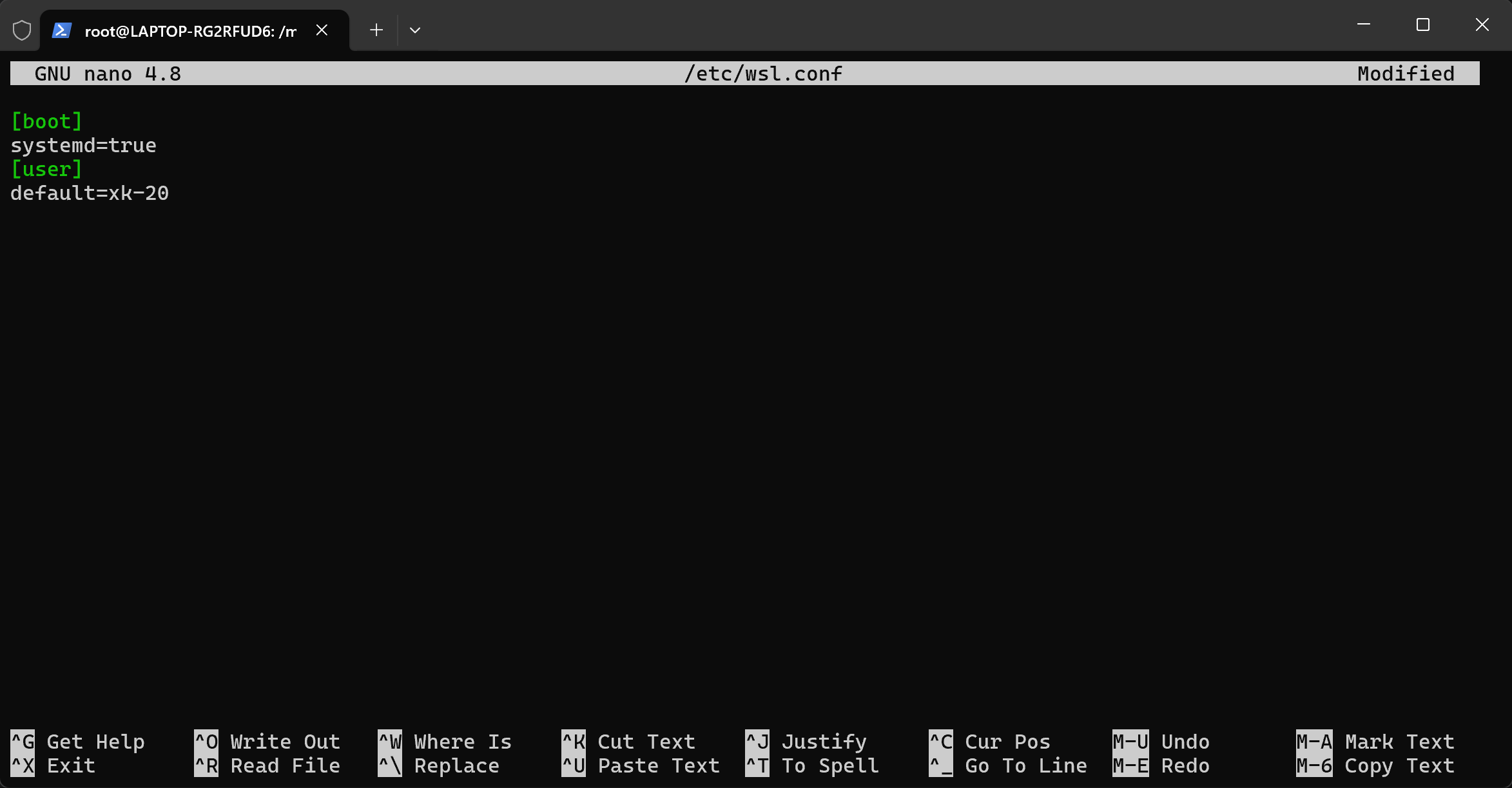 下次启动时自动加载普通用户:nano /etc/wsl.conf