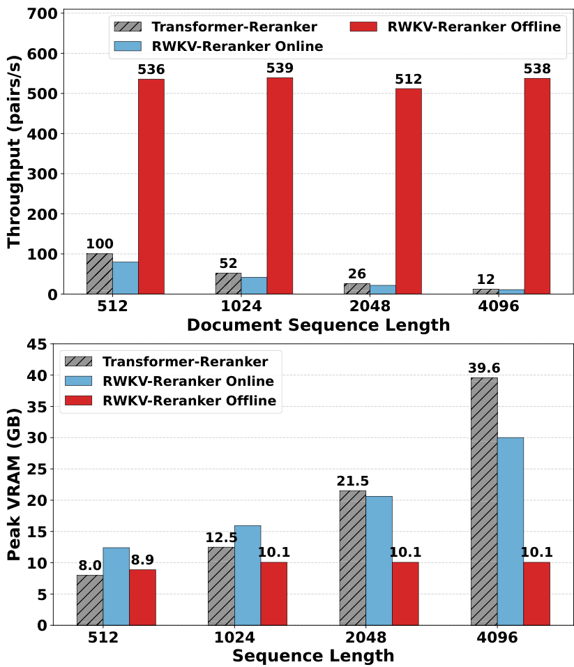 Figure 3: Performance benchmarking across various sequence lengths. Baseline: mxbai-renark-large-v2 (1.5B) (Li et al., 2025) with FlashAttention-2 vs. Ours: EmbeddingRWKV-1.4B + RWKV-Reranker-1.3B. Top: Throughput comparison (pair/s), where higher is better. Bottom: Peak VRAM usage (GB), where lower is better.