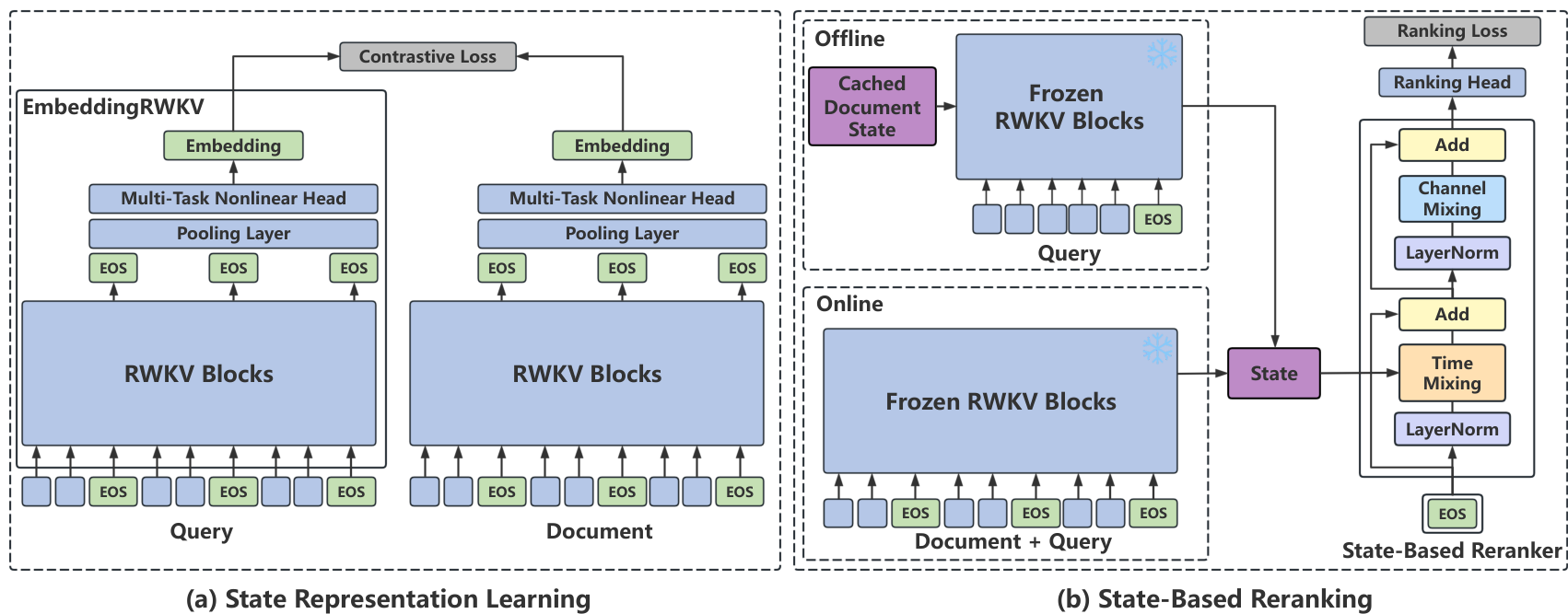 在这项工作中,我们提出了以状态为中心的检索(State-Centric Retrieval),这是一种从架构和流水线角度提高效率的新型检索范式。在模型架构层面,我们采用了 RWKV 模型,这是一种具有矩阵值隐藏状态的线性 RNN,其计算复杂度随序列长度呈线性增长,空间复杂度为常数。与基于 Transformer 的模型相比,RWKV 在计算和空间方面都显著提高了效率。在流水线层面,我们引入了一个统一的检索框架(图1),该框架利用可重用状态作为检索和重排序阶段的共享表示,从而实现信息重用并消除冗余计算。