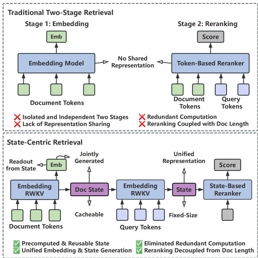 Original Abstract: Current Retrieval-Augmented Generation (RAG) systems typically employ a traditional two-stage pipeline: an embedding model for initial retrieval followed by a reranker for refinement. However, this paradigm suffers from significant inefficiency due to the lack of shared information between stages, leading to substantial redundant computation. To address this limitation, we propose \textbf{State-Centric Retrieval}, a unified retrieval paradigm that utilizes "states" as a bridge to connect embedding models and rerankers. First, we perform state representation learning by fine-tuning an RWKV-based LLM, transforming it into \textbf{EmbeddingRWKV}, a unified model that serves as both an embedding model and a state backbone for extracting compact, reusable states. Building upon these reusable states, we further design a state-based reranker to fully leverage precomputed information. During reranking, the model processes only query tokens, decoupling inference cost from document length and yielding a 5.4 × \times ×--44.8 × \times × speedup. Furthermore, we observe that retaining all intermediate layer states is unnecessary; with a uniform layer selection strategy, our model maintains 98.62% of full-model performance using only 25% of the layers. Extensive experiments demonstrate that State-Centric Retrieval achieves high-quality retrieval and reranking results while significantly enhancing overall system efficiency. Code is available at \href{https://github.com/howard-hou/EmbeddingRWKV}{our GitHub repository}.