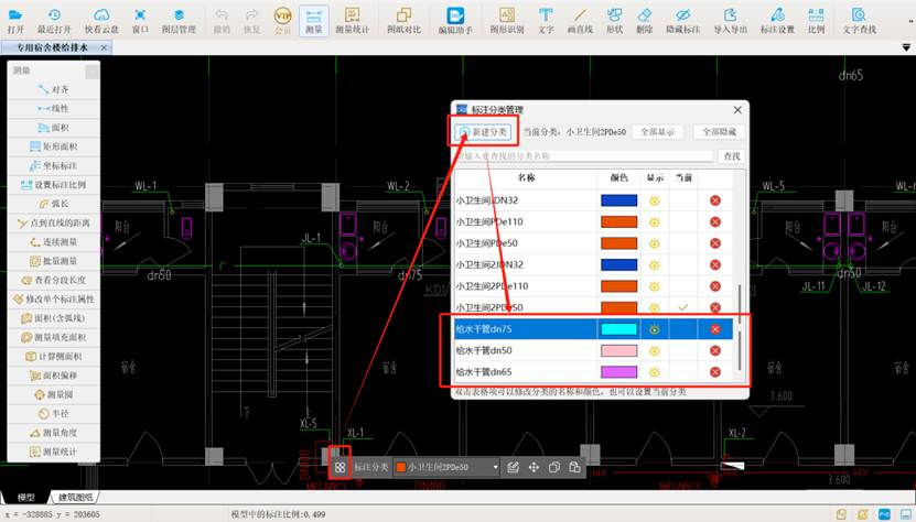 (1)通过【标注分类管理】功能,以不同的颜色及名称进行标注,便于后续水平干管分类统计。