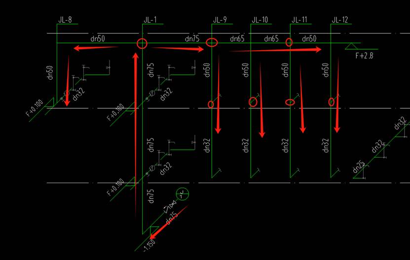 如图所示,给水回路由检查井J/1接入引入管dn75水平干管引入室内,再通过立管JL-1分流至各干管,最终接入支管。工程量计算需按管径、材质分别列项,其中变径点识别是关键-变径点通常设置在三通位置(如图中圆圈标注处)。