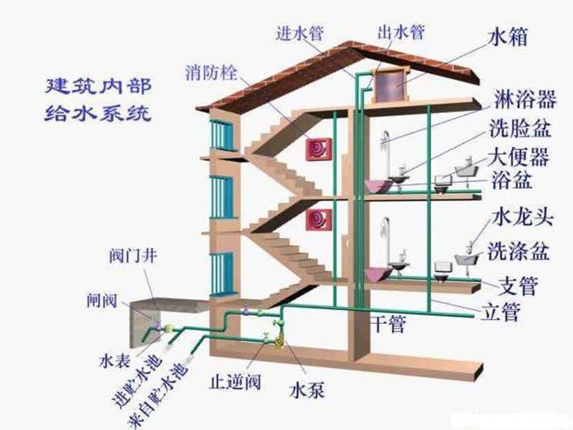 1)引入管(进户管):室外给水管网与室内给水管网之间的连接管段。